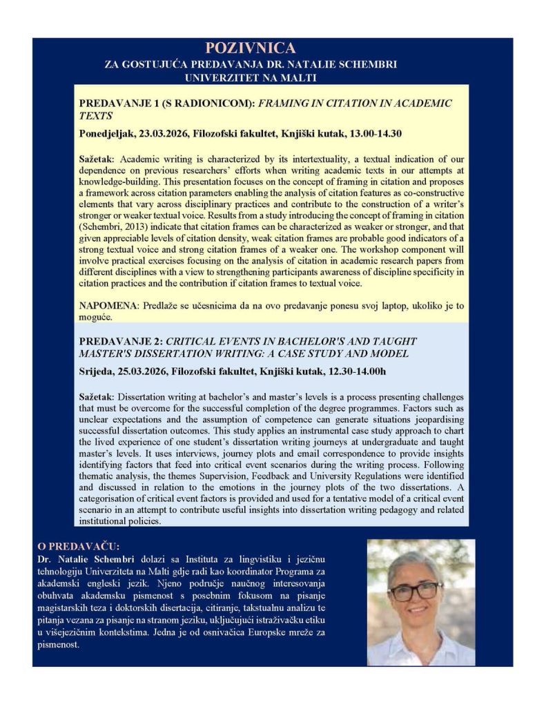 Pozivamo vas na gostujuća predavanja koja će održati Dr. Natalie Schembri sa Instituta za lingvistiku i jezičnu tehnologiju Univerziteta na Malti. Predavanja su namjenjena nastavnom osoblju svih fakulteta Univerziteta u Tuzli kao i studentima svih programa drugog i trećeg ciklusa, odnosno: